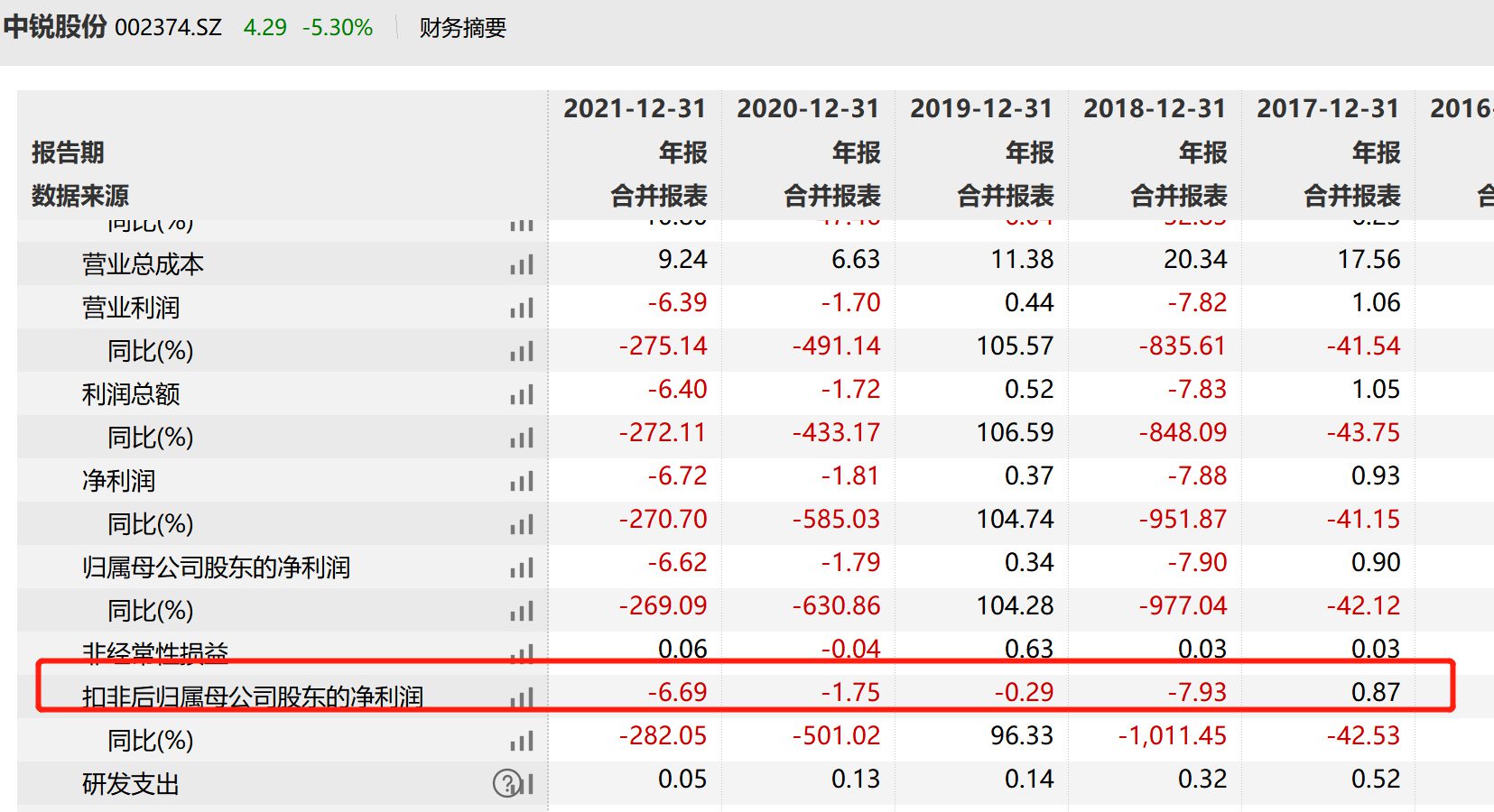 财报显示,中锐股份扣非后净利润自2018年起连续四年均为负且2021年亏损面较上年同期进一步扩大,两大主营业务质中园林绿化板块2021年毛利率为-346.35%,较上年同期大幅下降331.21%。