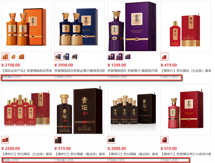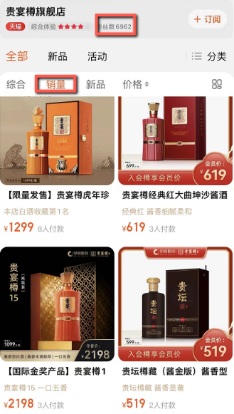 界面新闻记者无法找到“贵宴樽”的官方网站和贵宴樽产品介绍,目前只能通过淘宝和京东这两个平台获取贵宴樽相关信息。淘宝的贵宴樽旗舰店粉丝关注量为6962名,销量最高的产品贵宴樽虎年珍也只有8单,亦有产品0销量。京东平台大抵也如此。