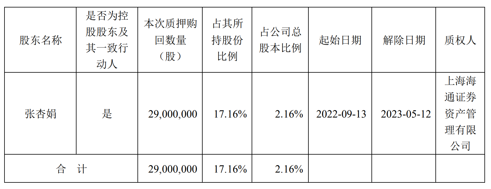 公告显示,2022年9月13日,张杏娟将其持有的部分公司股份5000万股质押给上海海通证券资产管理有限公司。张杏娟于2023年5月12日将上述股份办理了部分购回操作,购回2900万股,占总股本2.16%。