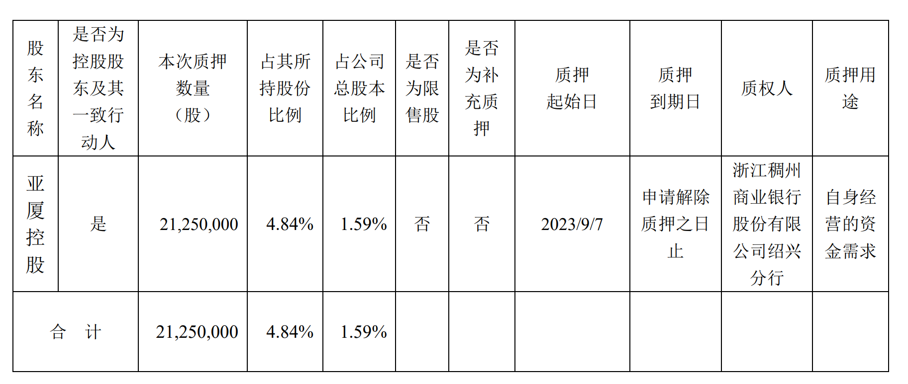 公告显示,亚厦股份于近日接到控股股东亚厦控股有限公司(以下简称“亚厦控股”)的通知,获悉亚厦控股于2023年9月7日将其持有的2125万股股份办理了质押,占亚厦股份总股本比例为1.59%。
