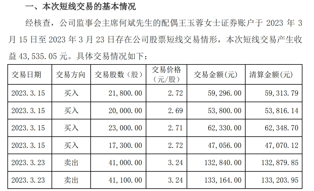24日盘后,国创高新公告,公司于近日收到公司监事会主席何斌出具的《关于本人配偶买卖公司股票构成短线交易的情况说明及致歉函》。何斌配偶王玉蓉的证券账户于2023年3月15日和2023年3月23日存在买卖公司股票的情形,构成短线交易。