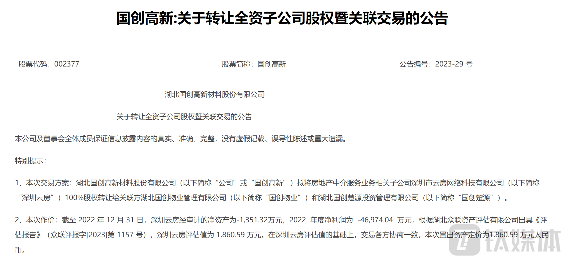 不过放弃深圳云房或许有助于国创高新业绩扭亏。2022年度,国创高新亏损额度为5.39亿元,其中,深圳云房亏损金额为4.7亿元。此外,在2020年年报、2021年年报中,国创高新已分别对收购深圳云房形成的商誉计提减值29.16亿元、3.03亿元,国创高新本次资产剥离并不会产生商誉减值。