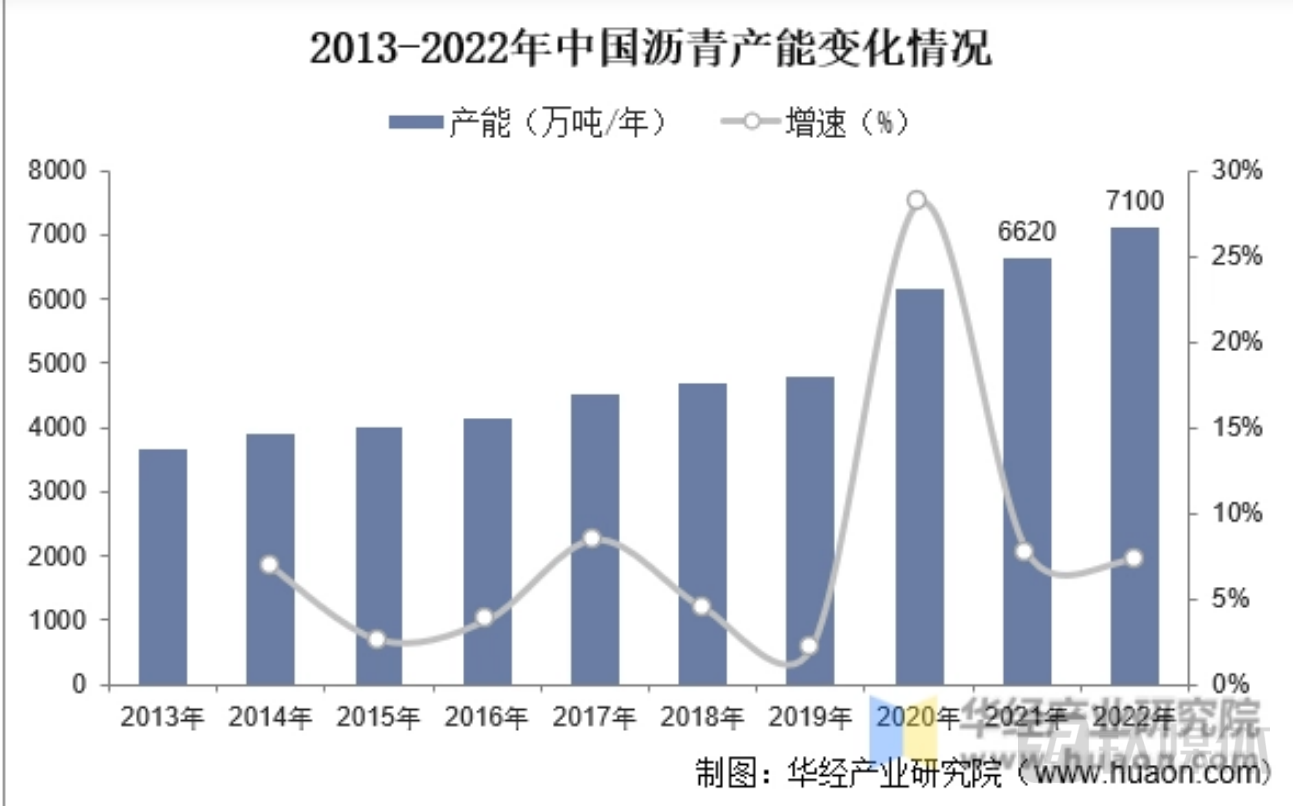 从行业来看,我国沥青供给方面始终处于产能过剩的状态。一方面各大沥青生产企业产能不断扩张,另一方面,新增沥青产量跟不上产能扩张速度。据第三方数据统计,2022年中国沥青产能为7100万吨/年,较2021年沥青产能增加480万吨/年或7.25%,沥青产能延续上升趋势,但产能增加趋势与2021年基本持平。