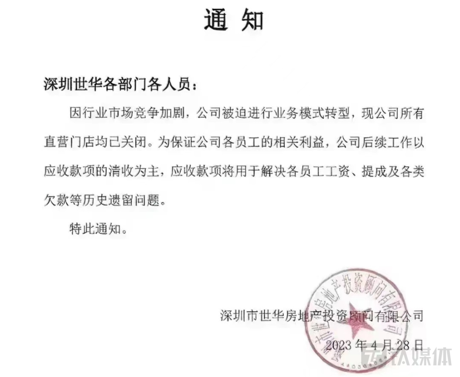 另值得一提的是,今年5月初,深圳云房持有的Q房网陷入“倒闭传闻”。一份深圳市世华房地产投资顾问有限公司发布的通知显示,因行业市场竞争加剧,公司被迫进行业务模式转型,现公司所有直营门店均已关闭。为保证公司各员工的相关利益,公司后续工作以应收款项的清收为主,应收款项将用于解决各员工工资提成及各类欠款等历史遗留问题,落款时间2023年4月28日。