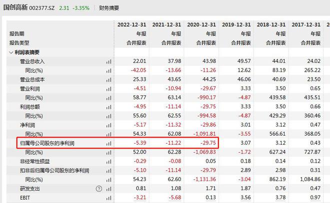 财务数据显示,国创高新近年来业绩承压,2020年至2022年,公司营业收入持续回落,净利润分别亏损29.75亿元、11.22亿元和5.39亿元。