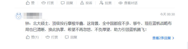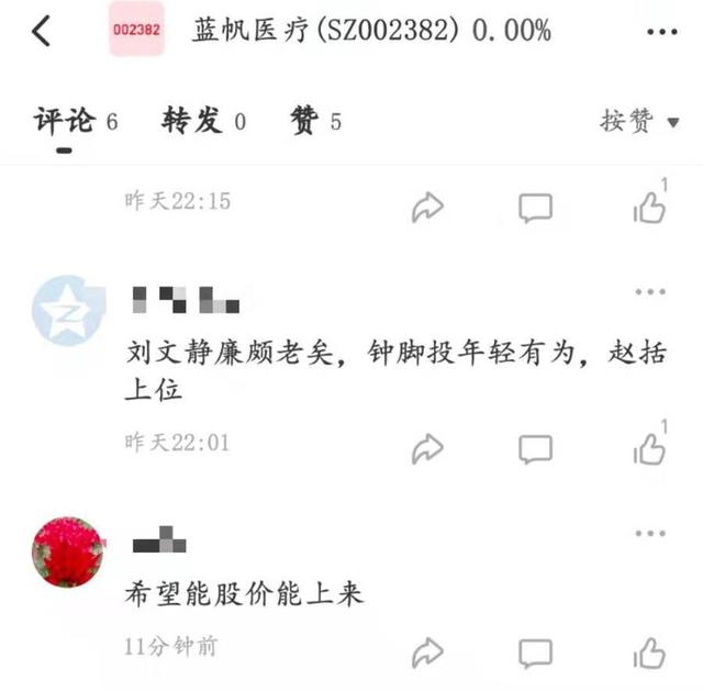 股吧里,不少股民对蓝帆医疗此次人事变动表达了看法。有的认为,“北大硕士,顶级投行摩根华鑫,这背景,全中国都应不多,够牛”“希望股价能上来”;不过,也有股民表示,“刘文静廉颇老矣,钟脚投年轻有为,赵括上位”。