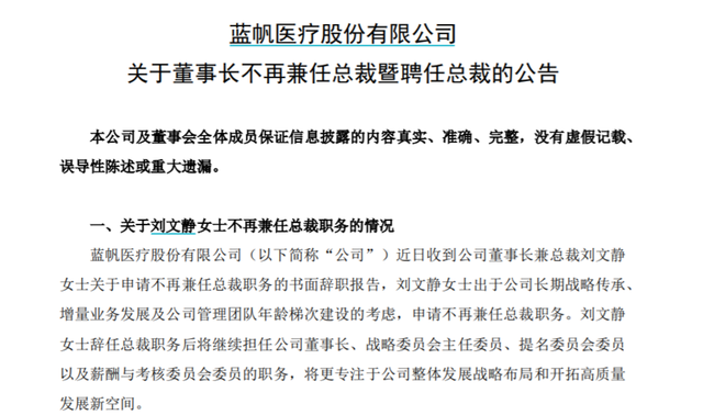 蓝帆医疗称,出于公司长期战略传承、增量业务发展及公司管理团队年龄梯次建设的考虑,现年51岁的刘文静不再兼任总裁,辞任后将继续担任公司董事长,总裁一职由现年36岁的原副总裁兼董秘钟舒乔接任,钟舒乔任职后,将不再担任副总裁、首席资本官,将继续担任董事,兼任董事会秘书直至公司重新聘任董事会秘书。