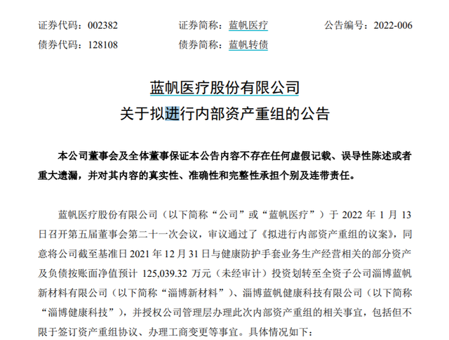 同日,蓝帆医疗宣布,董事会审议通过了《拟进行内部资产重组的议案》,同意将公司截至2021年12月31日与健康防护手套业务生产经营相关的部分资产及负债按账面净值预计12.50亿元(未经审计),投资划转至全资子公司淄博蓝帆新材料有限公司、淄博蓝帆健康科技有限公司。