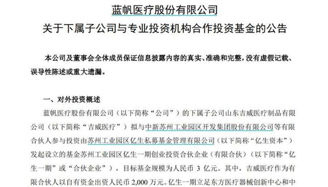 此外,蓝帆医疗公告称,下属子公司吉威医疗拟与中新苏州工业园区开发集团股份有限公司等有限合伙人,参与投资由亿生资本发起设立的基金苏州工业园区亿生一期创业投资合伙企业(有限合伙)(“亿生一期”),目标基金规模为人民币3亿元。其中,吉威医疗作为有限合伙人以自有资金出资人民币2000万元。