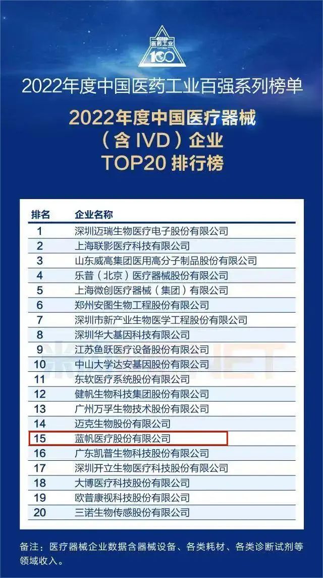 经过专家委员会严谨、科学地评审后,蓝帆医疗凭借强大的创新驱动力和优秀的专业推广力再次荣登“2022年度中国医疗器械(含IVD)企业TOP20排行榜”,这也是蓝帆医疗首次入选2018年度榜单后,连续5年荣登榜单。同时入围的还有迈瑞医疗、联影医疗、微创医疗、乐普医疗、鱼跃医疗等。