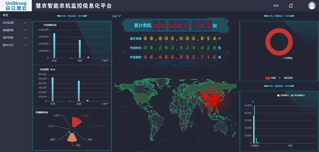 同时,合众思壮将物联网技术、大数据、人工智能和云计算等先进技术深度融合,构筑了更加智慧化的农业信息化解决方案和农业大数据平台。使用这些产品,用户通过遥感技术应用和精准测算,对作物长势、病虫害和生产环境进行全程数字化监测,实现整个农业生产过程全监管。通过农业大数据平台管理的耕地超过3600万亩,同时为50余万种植户提供数字化服务。通过智能农机监控信息化平台,用户可以对农机开展定位监测、状态监测、轨迹跟踪、作业面积统计、指挥调度、路线规划等科学管理。各种管理平台的结合构建并形成了一套完整的、具有创新性的智能农业管理体系,对推动中国的农业现代化发展发挥了积极作用。