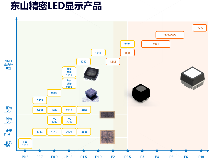 除了正装IMD,东山精密也布局了倒装IMD,东山精密的倒装IMD采用超高亮倒装芯片生产,表面经过超黑墨色处理,对比度极佳;由于是无金线封装,死灯概率低,可靠度极高;产品适用于P0.6、P0.7、P0.94等规格的间距。其中倒装二合一包括了FC1707、FC2210等规格,倒装四合一有FC1010等规格。