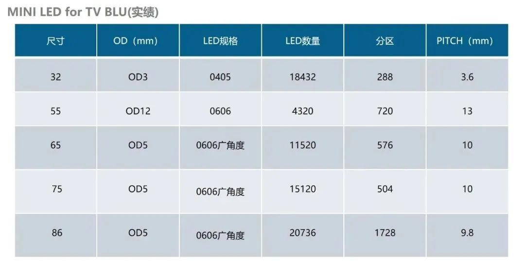 Mini LED背光方面,东山精密Mini LED背光方面已具备批量供货能力,其中应用于TV产品已开始批量出货,应用于PAD的产品在小批量试产中。在TV方面,其产品已应用于32、55、65、75、85吋产品之中。