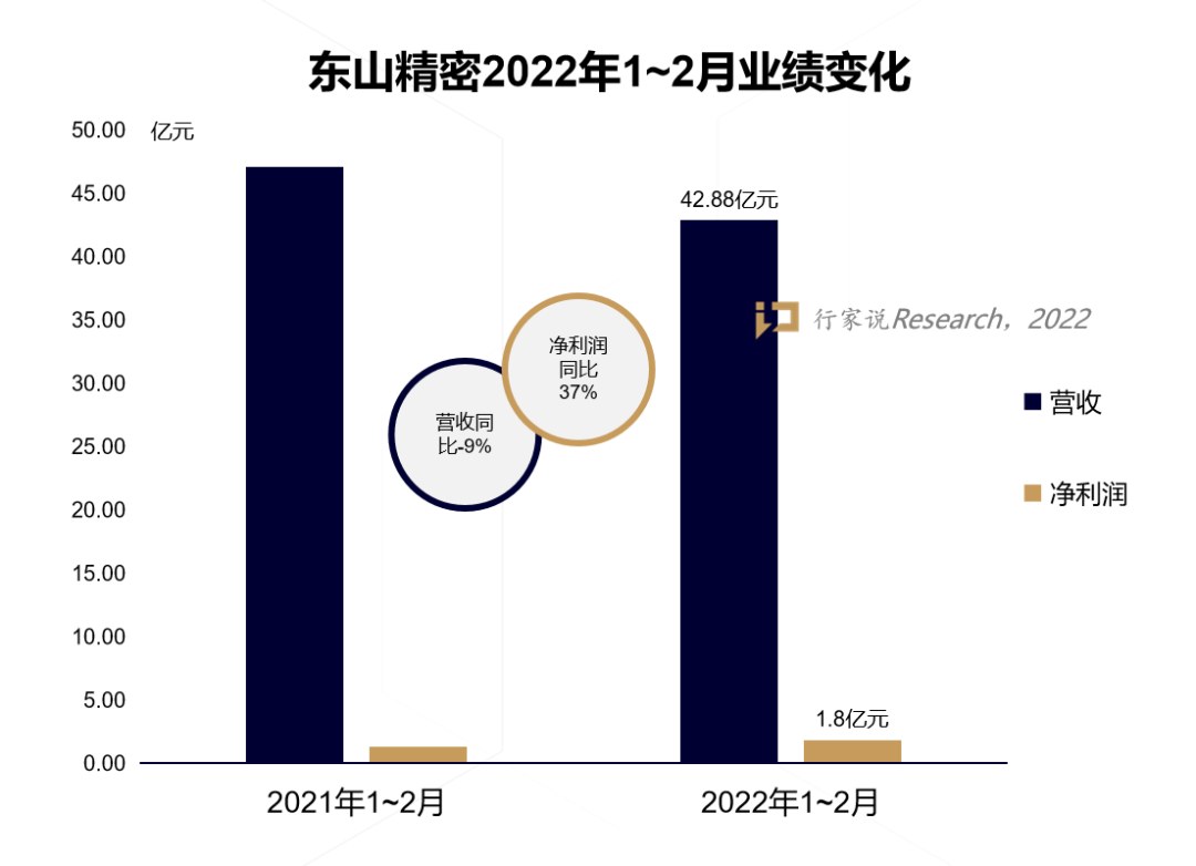 据公告显示,2022 年 1-2 月,东山精密克服疫情带来的不利影响,努力保证生产和交付。经其初步核算,2022 年 1 至 2 月实现营业收入约 42.88 亿元,同比减少约 9%(主要系公司触控显示业务上年同期主要客户集中交付量较大,本期恢复正常);2022 年1 至 2 月实现归属于上市公司股东的净利润约 1.8 亿元,同比增长约 37%。