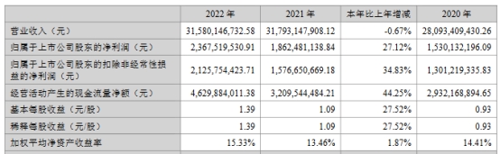 2023年1-3月,公司实现营业收入65.12亿元,同比下降10.95%;实现归属于上市公司股东的净利润4.72亿元,同比增长29.49%;实现归属于上市公司股东的扣除非经常性损益的净利润2.80亿元,同比下降7.87%;经营活动产生的现金流量净额17.99亿元,同比增长162.39%。