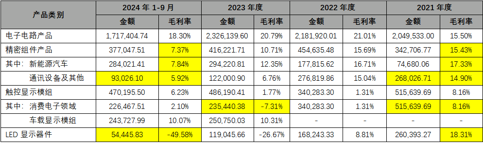 触控显示模组产品方面,其明细消费电子领域业务毛利率于报告期内也同样出现大幅下滑,2022年-2023年,该细分产品营收同比持续大幅下滑分别达34.01%和30.81%,导致公司消费电子领域触控显示模组产品对应各期毛利率分别仅为1.31%、-7.31%,2023年该业务已一度处于亏损经营。至2024年前三季度,发行人该细分产品毛利率虽有所提升至2.1%,但仍然远远不及2021年8.16%的毛利率水平。