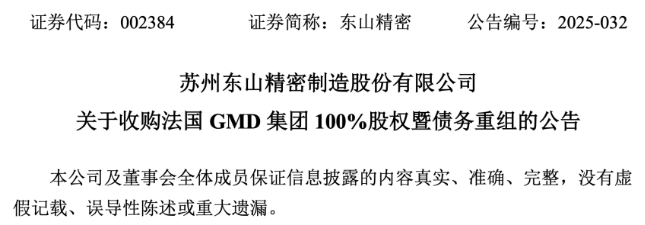 5月13日,东山精密发布公告称,为建立公司在欧洲产业布局,提升公司在汽车零部件领域市场规模,公司子公司DSBJ PTE. LTD(以下简称ldquo;DSGrdquo;)拟收购法国Groupe Meacute;canique Deacute;coupage(以下简称ldquo;GMD集团rdquo;)100%股权并对其进行债务重组,交易金额合计约1亿欧元(折合人民币约8.14亿元)。此次交易完成后,GMD集团将成为东山精密的全资子公司。