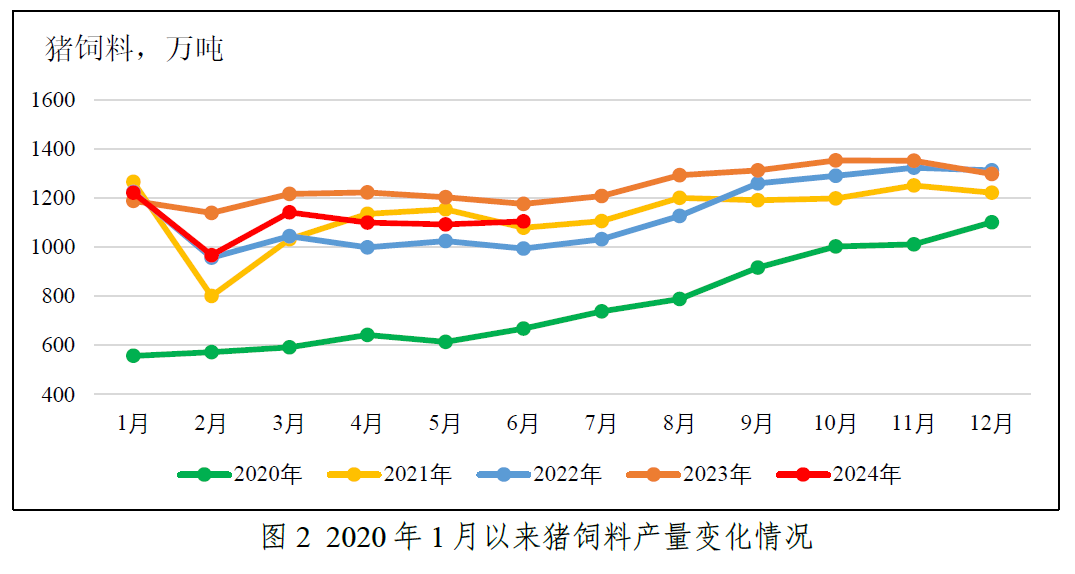 值得注意的是,据官方最新公布数据显示,2024年上半年全国工业饲料总产量14539万吨,同比下降4.1%。其中,配合饲料、浓缩饲料、添加剂预混合饲料产量同比分别下降4.0%、10.8%、0.7%。上半年,猪饲料产量6630万吨,同比下降7.3%。其中,仔猪、母猪、育肥猪饲料产量同比分别下降13.5%、9.4%、5.0%。