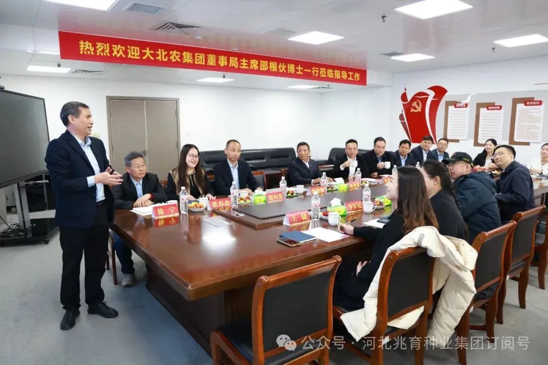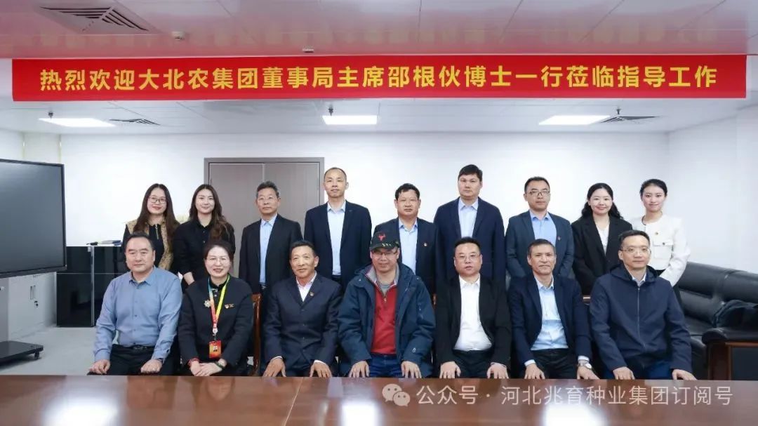 2025年3月14日,大北农集团董事局主席邵根伙博士、大北农创种科技常务副总裁李军民博士、大北农智慧农业基金总经理齐政、大北农董事局办公室主任王婕一行四人赴到访育种业集团,兆育种业集团首席科学家赵劲霖老师、董事长赵育进、总裁韩俊强等兆育高层热情接待。