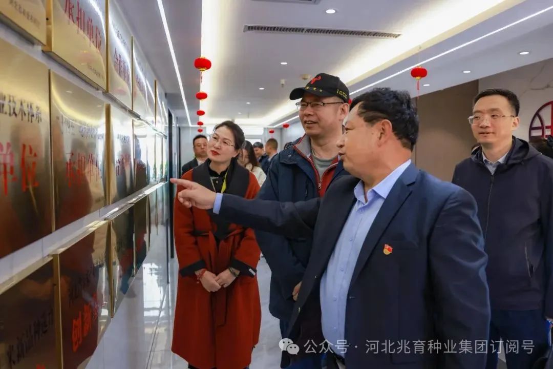 来到兆育种业集团石家庄总部,集团副总裁、总农艺师贺东刚向大北农集团邵博士一行介绍兆育集团发展历程与荣誉墙陈列的重要奖项成就。