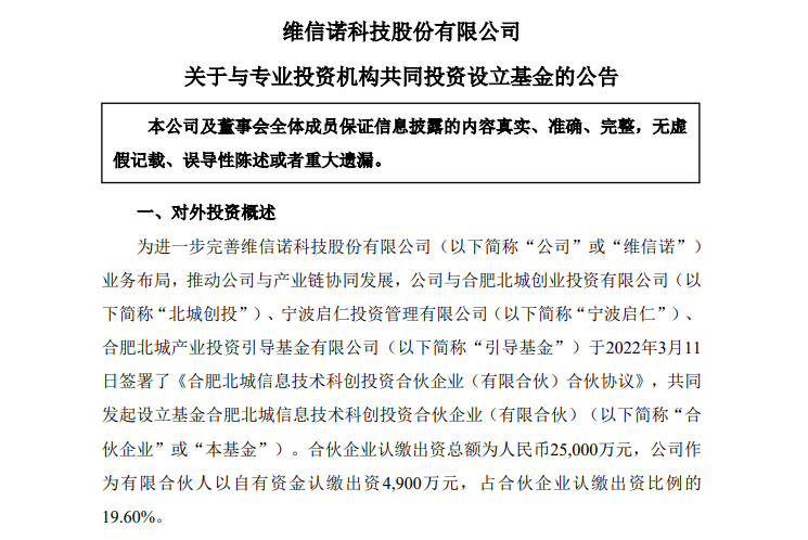维信诺3月14日晚间公告,公司与合肥北城创业投资有限公司、宁波启仁投资管理有限公司、合肥北城产业投资引导基金有限公司于2022年3月11日签署了《合肥北城信息技术科创投资合伙企业(有限合伙)合伙协议》,共同发起设立基金合肥北城信息技术科创投资合伙企业(有限合伙)。