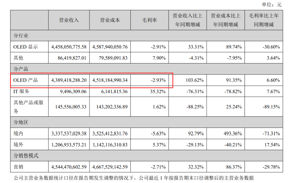 维信诺为何巨亏?其财报显示,虽然维信诺OLED产品的收入同比增103%,达到43.89亿元,但同时营业成本已达到45.18亿元,毛利率只有-2.93%。也就是说,维信诺的OLED“卖得越多、亏得越多”。