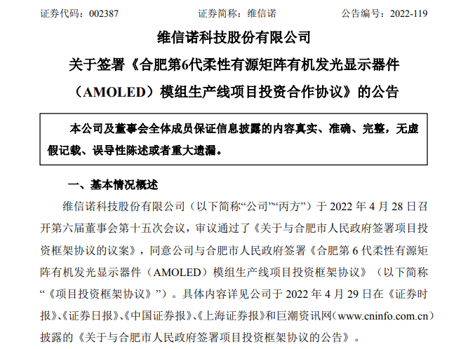 11月25日晚间,维信诺发布公告,公司拟与合肥东欣投资有限公司(简称"合肥东欣")以及合肥鑫城国有资产经营有限公司(简称"合肥鑫城")签署《合肥第6代柔性有源矩阵有机发光显示器件(AMOLED)模组生产线项目投资合作协议》。