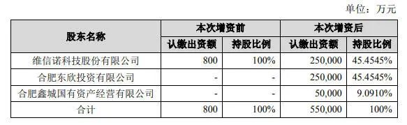 本项目投资总额为110亿元人民币,其中合肥维信诺电子注册资本55亿元,合肥东欣出资25亿元(股权占比45.4545%),合肥鑫城出资5亿元(股权占比9.0910%),维信诺出资25亿元(股权占比45.4545%)。