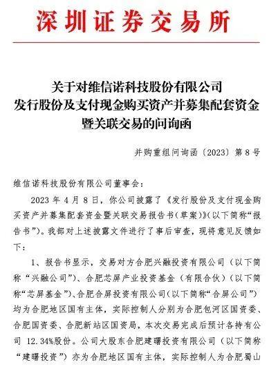 4月19日,维信诺科技股份有限公司(以下简称“维信诺”或“公司”)收到深圳证券交易所关于对维信诺发行股份及支付现金购买资产并募集配套资金暨关联交易的问询函。问询函要求维信诺说明拟向合屏公司、芯屏基金、兴融公司发行股份及支付现金购买其所持有的合肥维信诺40.91%股权的交易是否符合上市公司重大资产重组管理办法规定等问题。