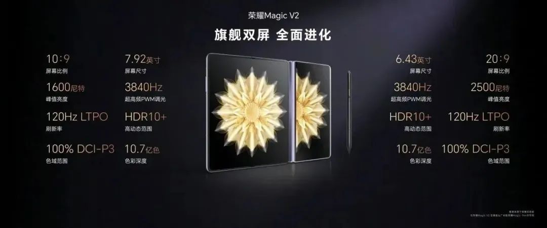 在画质方面,荣耀Magic V2系列内外屏均采用京东方自主研发的全新像素排列方式,极大消除屏幕显示的颗粒感,综合视觉效果大幅提升20%,搭配业界领先的内屏1600nits峰值亮度,外屏2500nits峰值亮度,显示画质清晰细腻,即使在户外强光下屏幕内容也清晰可见。