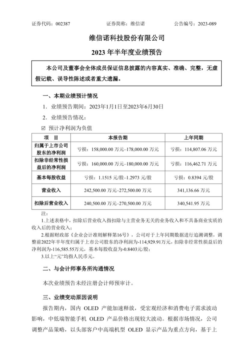 维信诺现发布 2023 半年度业绩预告,预计上半年实现营收区间为 24.25 亿元至 27.25 亿元,同比减少 20%到 29%,其中,第二季度预计实现营收为 16.56 亿元至 19.56 亿元,较第一季度增长 115%到 154%。