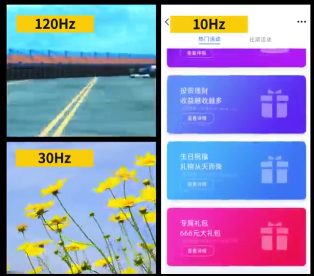 维信诺的分区多频技术搭载于智能手机终端,可根据局部显示需求的差异,以“行”为单位,让每个分区自适应为不同刷新率。比如,在显示静态图像、文本、时钟等低帧率内容时匹配低刷,针对视频、信息流内容匹配高刷,从而达到精准控制刷新率,实现降功耗的目的。