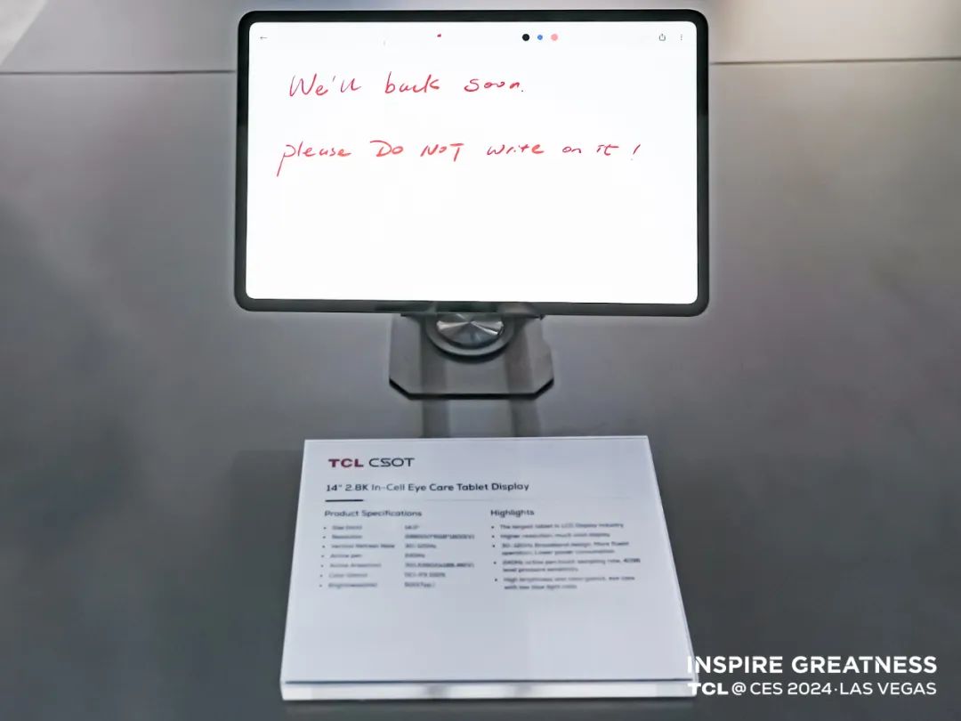 TCL华星展示了全球首款量产14吋2.8K In-cell主动笔护眼大尺寸平板,为业界最大的LCD平板显示屏。该产品拥有2.8K超高分辨率,支持30~120Hz宽频设计,保证画面流畅的同时降低功耗。其突破性的高色域、高亮设计搭配硬件低蓝光,可在缔造精彩视界之外,全面守护视觉健康。