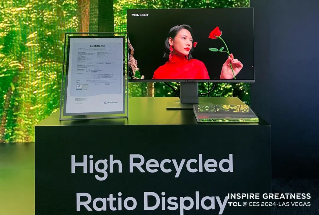 另外,还展示了获TüV莱茵“含回收材料产品”认证的TCL华星23.8英寸显示模组,该产品回收材料含量达51.5%,功耗比TCL华星首款能源之星ES8.0显示器低30%以上。