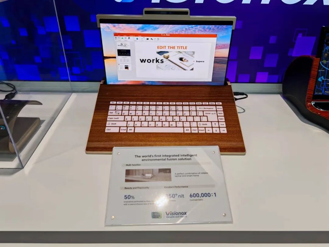 维信诺全球首款一体化智能环境融合解决方案,实现卷曲笔记本电脑与智慧家居的完美结合,可一机多用。需要办公时,收纳机构中的14.2英寸柔性 AMOLED 显示屏升起,分辨率2560×1392,满足高清画质要求。配备的智能表皮采用创新打孔式表皮,显示透过率50%(±5%波动),可“变身”为键盘,实现办公功能。不显示内容时,智能表皮则呈现木纹、金属等内饰效果,像“变色龙”一样与环境完美融为一体,将科技隐藏于无形。