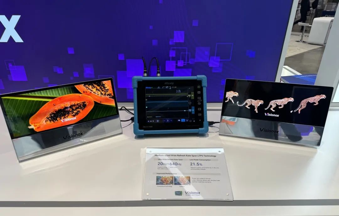 本次展会,维信诺首次面向海外发布中尺寸宽频LTPS技术。该技术具备超宽频、低功耗、强性能等优势,支持中尺寸AMOLED屏幕在20Hz-640Hz+超大区间范围的宽频驱动。