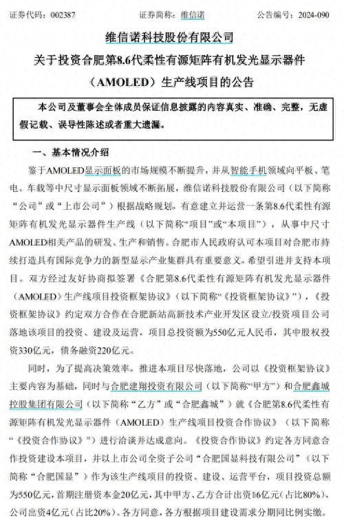 拟550亿元投建AMOLED生产线维信诺8月29日晚公告,经友好协商,公司和合肥市政府拟签署《合肥第8.6代柔性有源矩阵有机发光显示器件(AMOLED)生产线项目投资框架协议》(以下简称《投资框架协议》)。