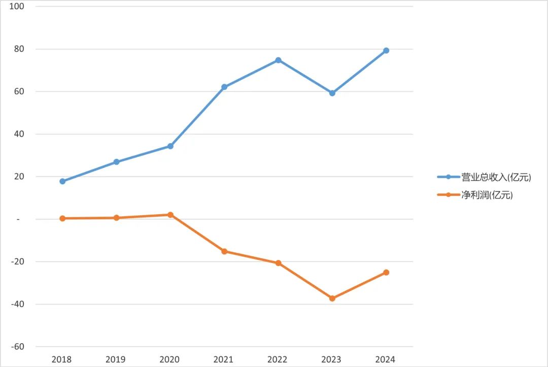 财报显示,2021年至2024年,维信诺营业收入分别为62.14亿元、74.77亿元和59.26亿元及79.29亿元,同比分别增长32.32%、20.31%、-20.74%及33.8%;与之对应的归母净利润分别为-15.20亿元、-20.66亿元、-37.26亿元及-25.05亿元,同比分别增长-846.91%、-35.91%、-80.31%及32.76%;扣非净利润分别为-17.82亿元、-22.19亿元、-38.02亿元及-32.02亿元。