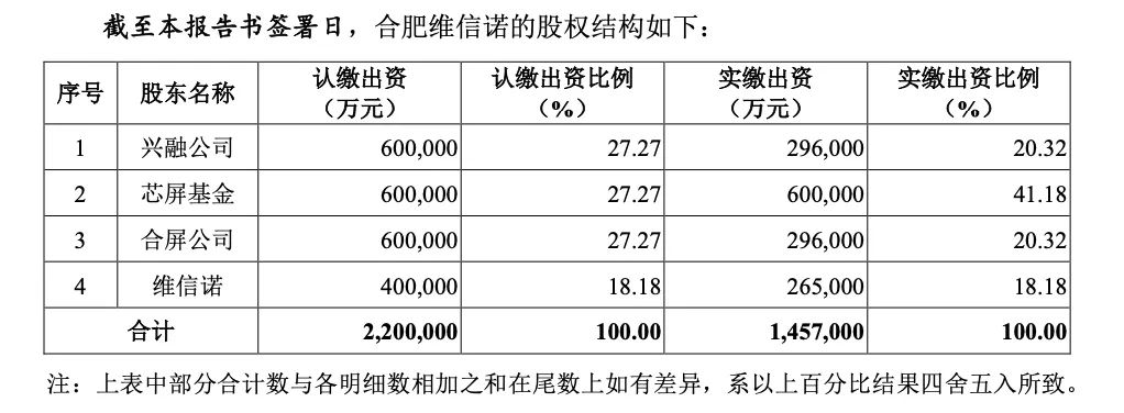 作为标的方,合肥维信诺成立于2018年9月,起初由上市公司维信诺全资设立。成立仅3个月后,合肥维信诺便增加了注册资本,引入合屏公司、芯屏基金、兴融公司三家具有合肥国资背景的股东,各自认缴出资60亿元,但除芯屏基金外,剩下两家均未完全实缴。目前,按照实缴出资额,芯屏基金为合肥维信诺的第一大股东,持股比例为41.18%,维信诺的控股比例为18.18%。