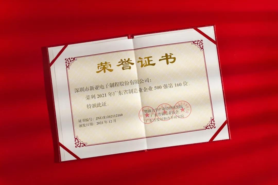 新亚制程作为广东制造业的一员,深耕电子产业30余年,始终坚持科技创新驱动高质量发展,凭借过硬的综合实力、卓越的技术,与华为、比亚迪、富士康、美的、立讯精密等知名企业一同入选,荣列广东省制造业企业500强第160位。