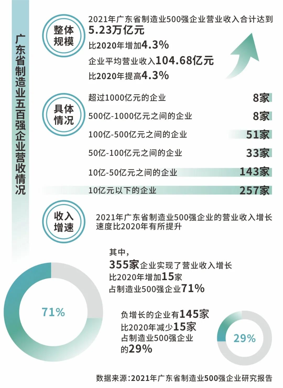 据悉,2021年“广东省制造业500强”企业排序评选,遵循“科学、权威、专业、公正、广泛”的评选原则,由评审专家委员会参照国际通行的方式,以2020年企业营业收入以及其他相关指标、数据为依据,对企业进行评审遴选,最终确定2021年广东省制造业500强企业,并正式发布研究报告。报告显示,2021年广东省制造业500强企业营业收入合计达到5.23万亿元,比2020年增加4.3%;资产总额合计达到5.11万亿元,平均资产总额为102.45亿元,比2020年有所提高;企业净利润总额3096.53亿元,比2020年增长16.6%。