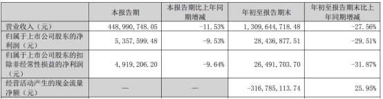 去年第三季度,公司实现营业收入448,990,748.05元,同比下降11.53%;实现归属于上市公司股东的净利润5,357,599.48元,同比下降9.53%;实现归属于上市公司股东的扣除非经常性损益的净利润4,919,206.20元,同比下降9.64%。