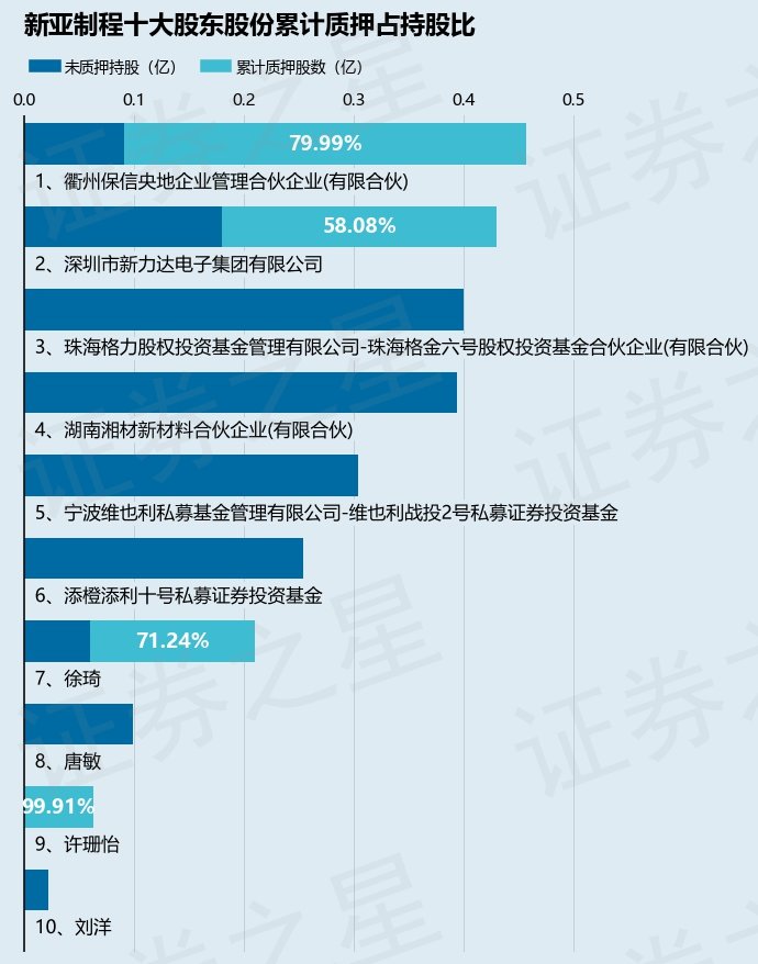 截止本公告日,股东衢州保信央地企业管理合伙企业(有限合伙)已累计质押股份3655.06万股,占其持股总数的79.99%,股东深圳市新力达电子集团有限公司已累计质押股份2500.0万股,占其持股总数的58.08%,股东徐琦已累计质押股份1495.0万股,占其持股总数的71.24%,股东许珊怡已累计质押股份629.0万股,占其持股总数的99.91%。本次质押后新亚制程十大股东的累计质押股份占持股比例见下图:
