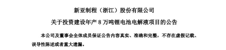7月24日晚间,新亚制程(002388)发布公告称,控股子公司新亚杉杉拟使用自筹资金投资建设“技改新增8万吨/年锂电池电解液项目”,项目总投资为1.97亿元,其中建设投资为1.17亿元,建设期利息为176.30万元,流动资金为7760万元。