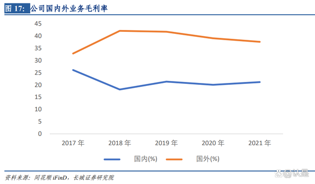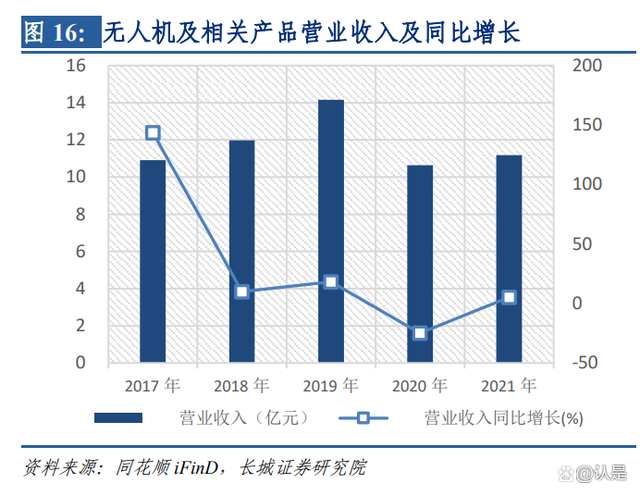 通过对公司年报中财务报表的分析,我们得出以下两个原因:首先,受海外疫情影响, 2019-2021 年国外业务的总营业收入分别为 9.01、8.2、5.48 亿元,分别同比下降了 16.79%、 9.02%、33.19%。同时 2021 年国外业务毛利率为 37.6%,高于国内业务的 21.2%。国外出口业务收入减少和国外出口业务毛利率本身低于国内业务两个因素共同作用引起公司无人机产品业务的毛利率下降。2022 年,随着国外业务逐渐回归正常水平、订单的交付数量增加,有望在未来改善盈利能力并逐步提升毛利率。
