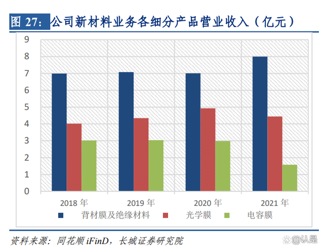 2021 年公司的新材料业务下的背材膜及绝缘材料、光学膜、电容膜营业收入分别为 8.0、 4.44、1.58 亿元,三类产品的营业收入比重分别为 27.4%、15.2%、5.4%,近年来背材膜及绝缘材料对新材料业务的营业收入贡献最大,占新材料业务板块营业收入的 50%左右。 2018-2021 年期间背材膜及绝缘材料与光学膜的营业收入呈稳定增长趋势,电容膜业务收入由 2018 至 2020 年的 3 亿元左右减小到 2021 年的 1.58 亿元。