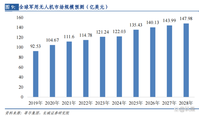 其中,军用无人机作为高性能信息化武器,是现代信息技术发展成果在军事方面的重要体现。自 20 世纪 70 年代以来,全球范围内不断有国家内部或者国家与国家之间爆发冲突,军用无人机也成为了增强国家自身国防实力的重要手段。并且军用无人机越来越频繁地出现在局部战争中,无人机的发展也被越来越多的国家置于重要的地位。根据蒂尔集团的报告,2019 年-2028 年全球军用无人机年产值(含采购)逐年增长,到 2028 年产值预计达到 147.98 亿美元,年产值(含采购)复合增长率约 5.36%,市场保持可持续的稳定发展。