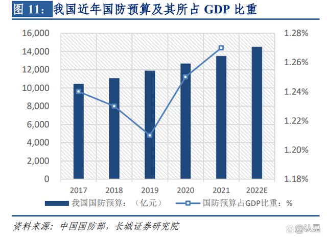 在军费绝对数值方面,2020 年中国国防支出预算约为 1782 亿美元,美国为 7500 亿美元, 2021 年中国国防支出预算约为 2090 亿美元,美国为 7400 亿美元。在军费与 GDP 占比方面,2017 至 2021 年的数据显示,中国国防费占国内生产总值平均比重约为 1.24%,远低于美国的约 3.24%。无论是国防预算的绝对数值还是相对数值,我国的国防预算支出与美国仍有较大差距。 2022 年全国财政安排国防支出预算 14760.81 亿元,比上年预算执行数增长 7.1%。这是时隔两年后中国国防经费增速重回“7%时代”。新冠疫情暴发之后的 2020 和 2021 年,中国国防经费增长均在 7%以下。2020 年中国国防支出预算为 12680 亿元人民币(约 1782 亿美元),比上年度增长 6.6%,2021 年则为 13795.44 亿元人民币(约 2090 亿美元),比 2020 年增长 6.8%。在此前,2016 年至 2019 年国防预算增长率均在 7%(含)以上。