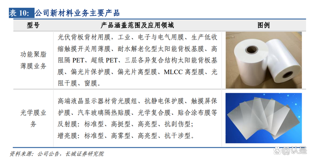 新材料业务方面,公司聚焦功能聚酯薄膜、光学膜两大业务版块,自初创成立时就专注于电子薄膜制造,经过多年深耕于高科技电子薄膜领域的工艺技术创新和新产品研发,尤其是超薄类聚酯膜材料,已经确立了在功能聚酯薄膜行业的领先位置。公司具备年产 8 万吨各类聚酯材料的生产能力,产品涵盖光伏背板背材用膜,工业、电子与电气用膜,光学用膜,保护膜,电子、胶带用膜,版纸用膜等多领域多规格产品。