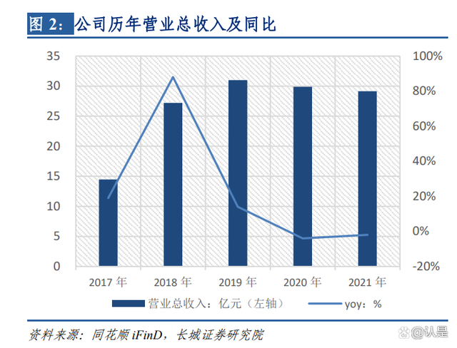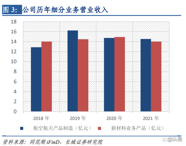 航天彩虹 2021 年度实现总营业收入 29.14 亿元,同比减少 2.49%,其中航空航天产品制造产业实现营收 14.53 亿元,新材料业务产品实现营收 14.02 亿元。自 2019 年开始,因无人机出口业务受疫情影响,公司总营业收入略有下滑,2020 年总营业收入为 29.88 亿元,同比减少 3.62%,但公司业绩总体较平稳。 2021 年公司的无人机业务板块营业收入为 14.53 亿元,新材料业务板块营业收入为 14.02 亿元。自 2018 年起,公司正式开始经营无人机业务,两个业务板块营业收入大致为 1:1,收入水平较为接近。